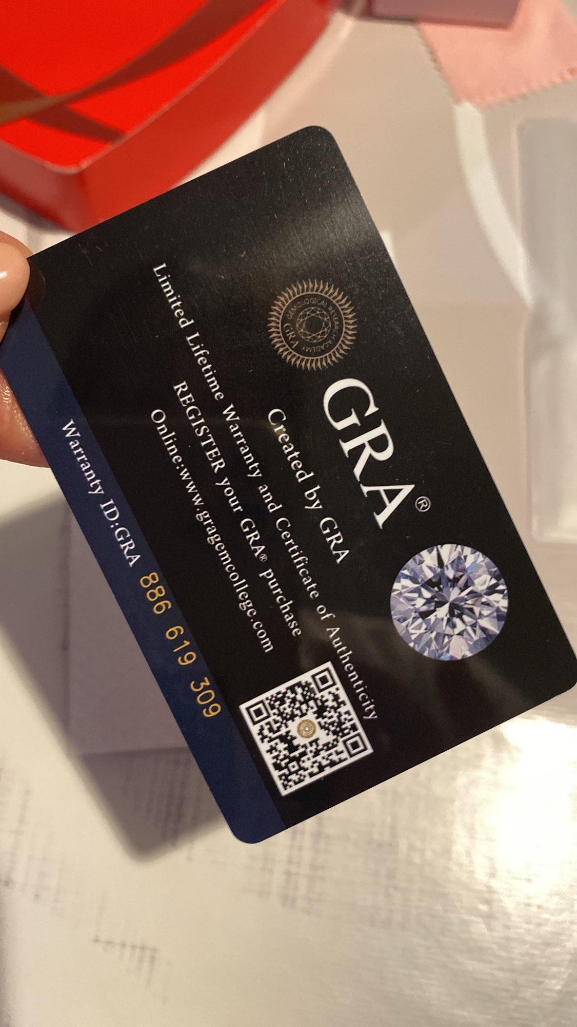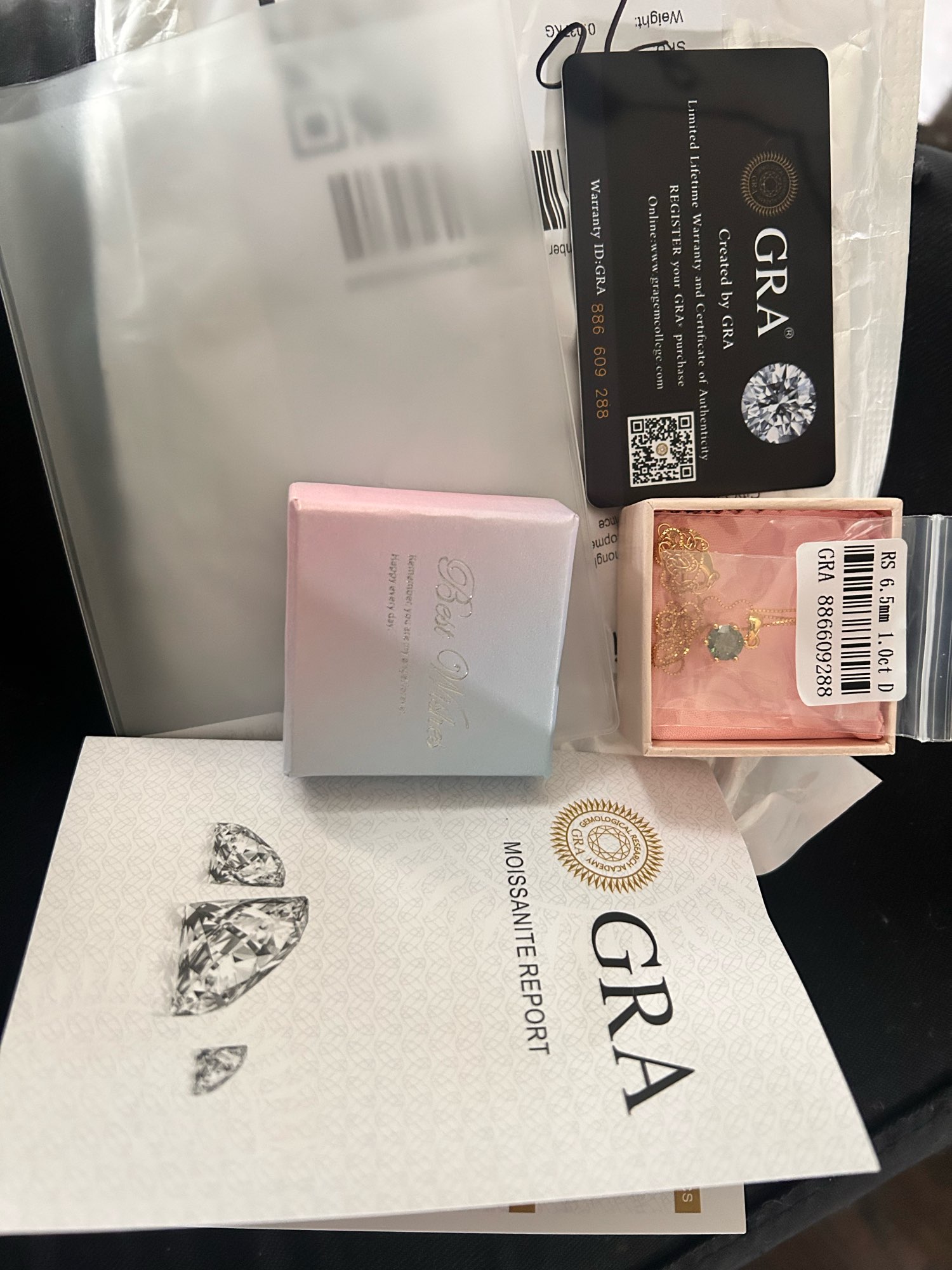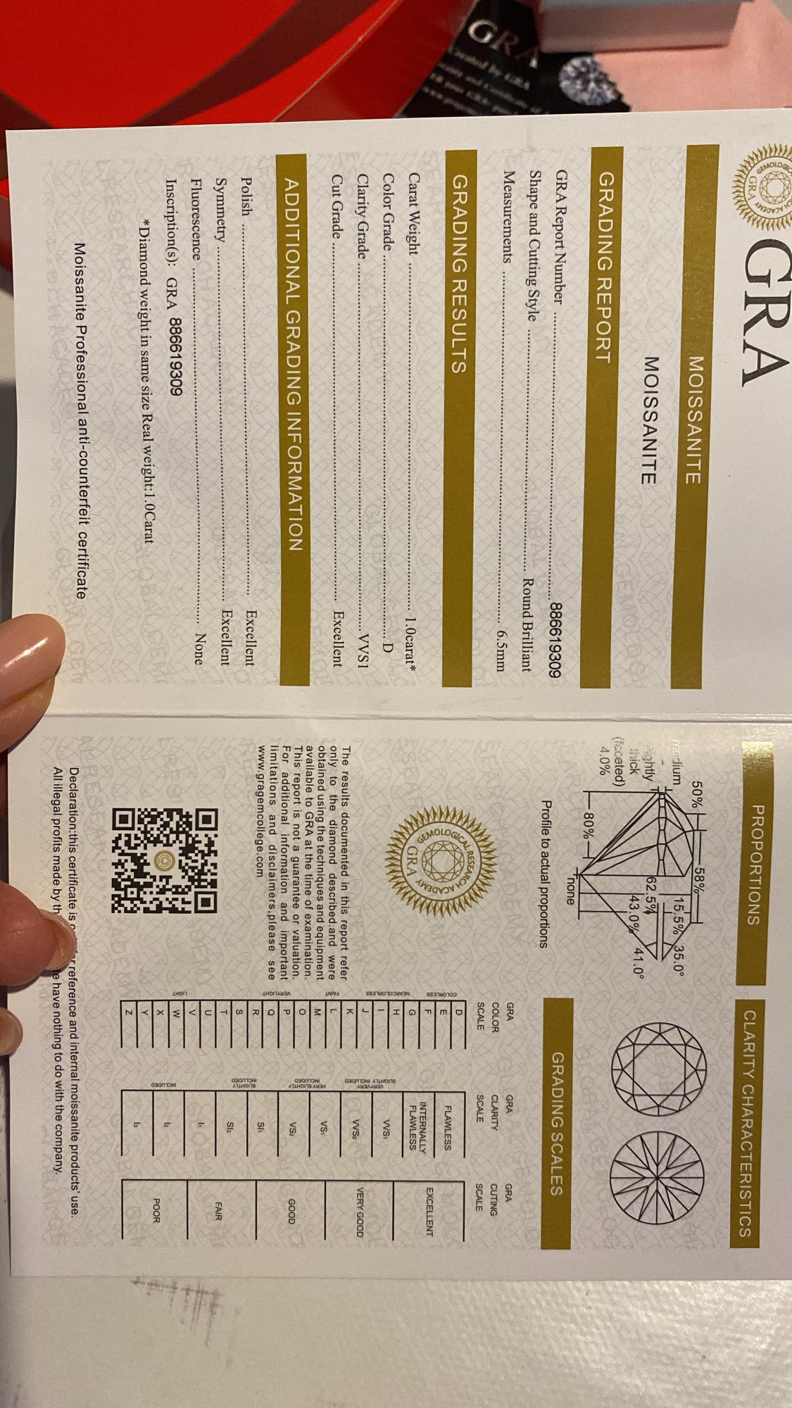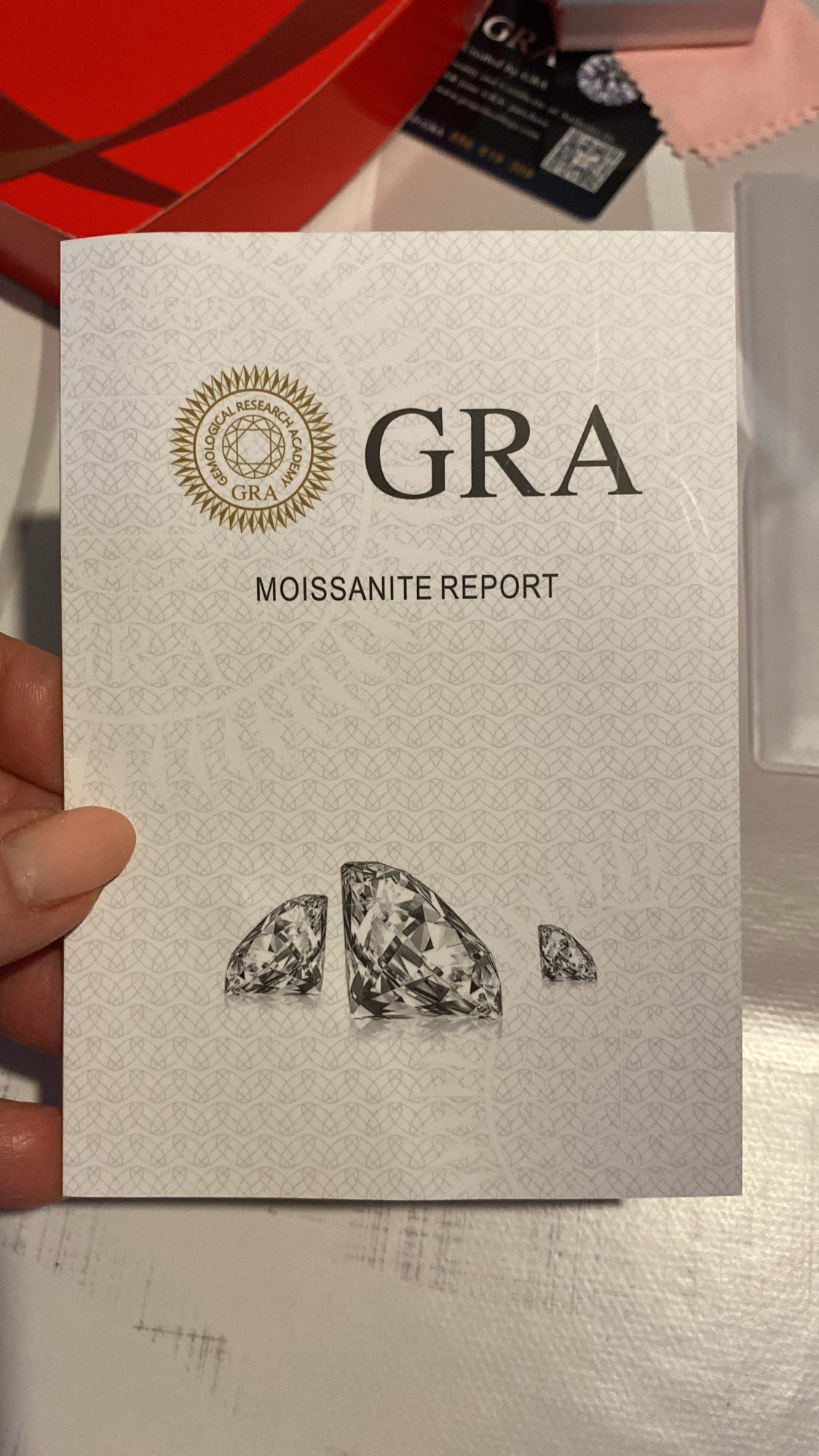 Very beautiful product. Shines like a real diamond. The certificate contains a QR code that leads to a website that indicates all the characteristics of the stone. This is definitely moissanite. Delivery to Ukraine is 10 days.