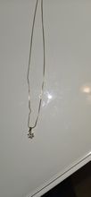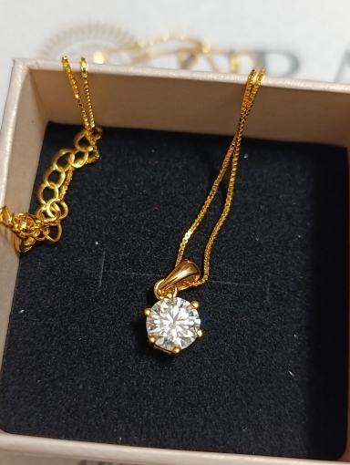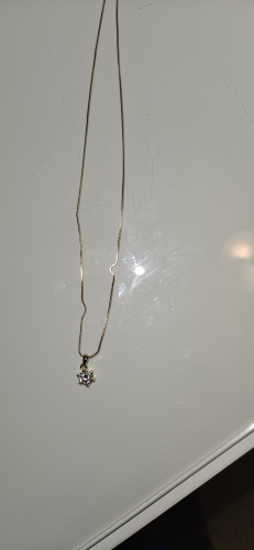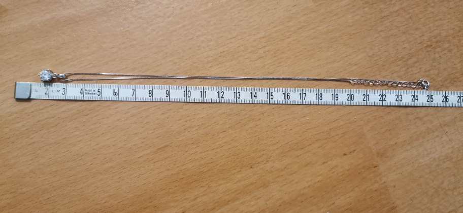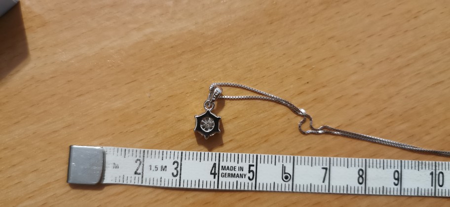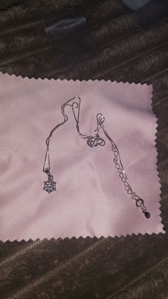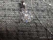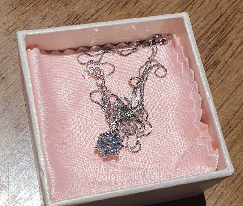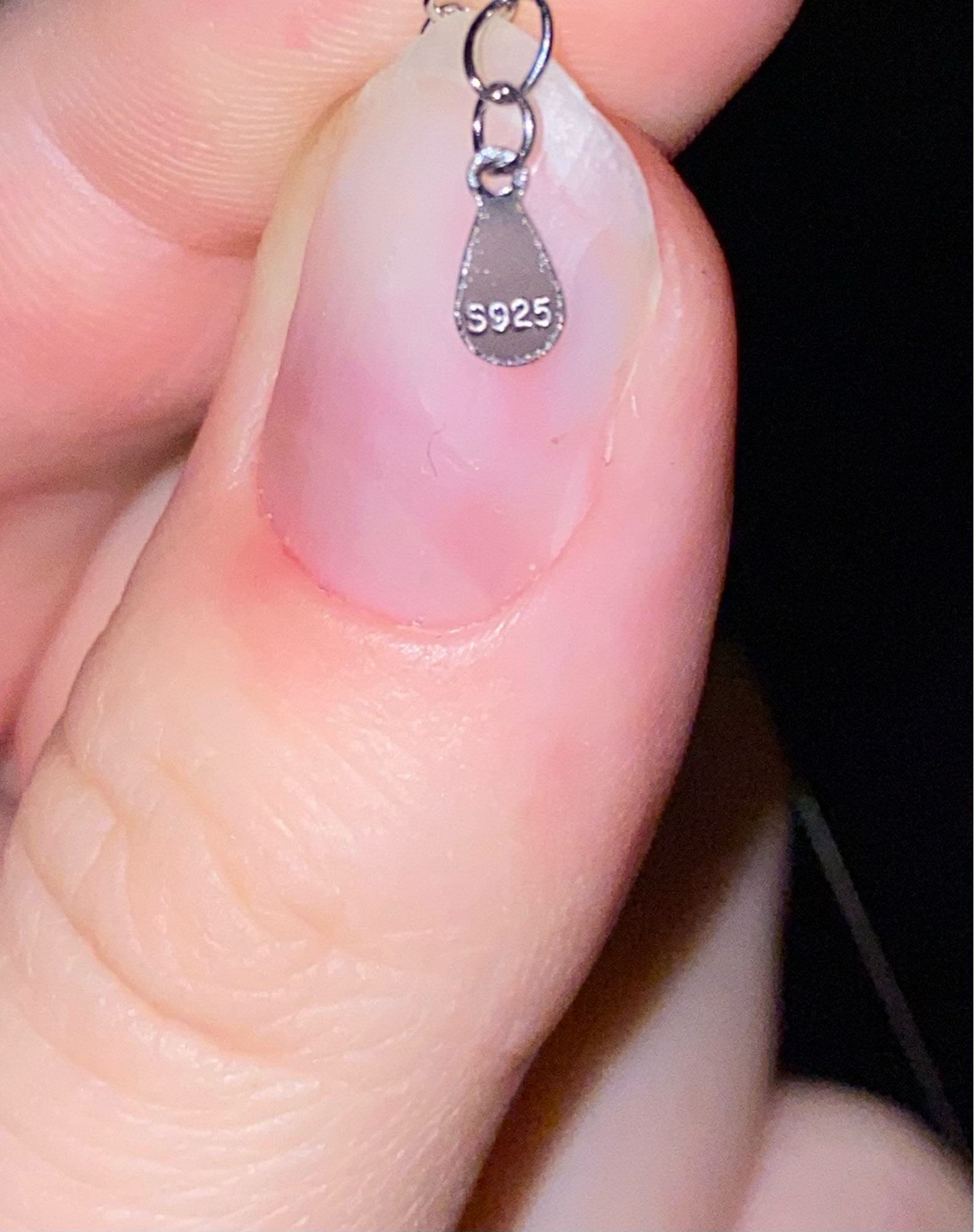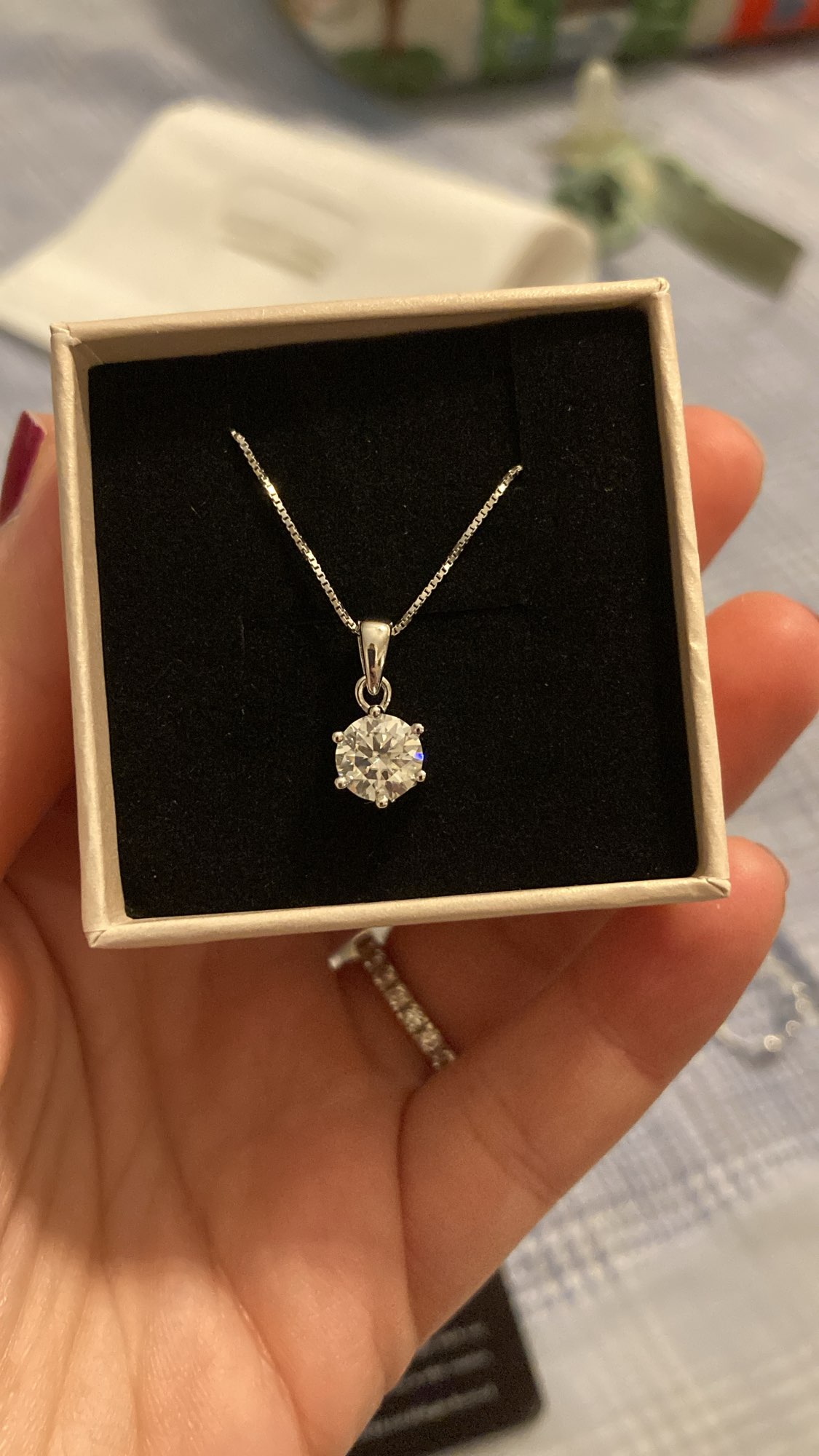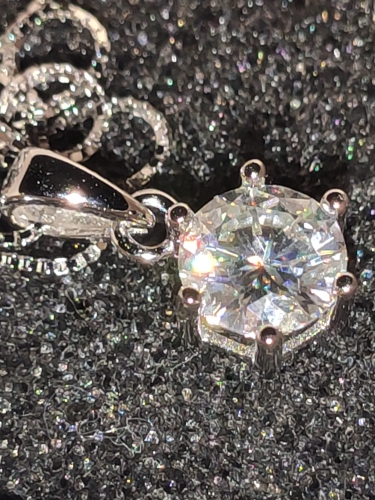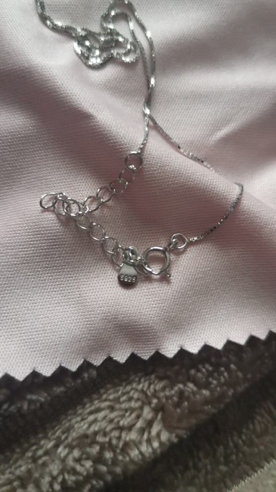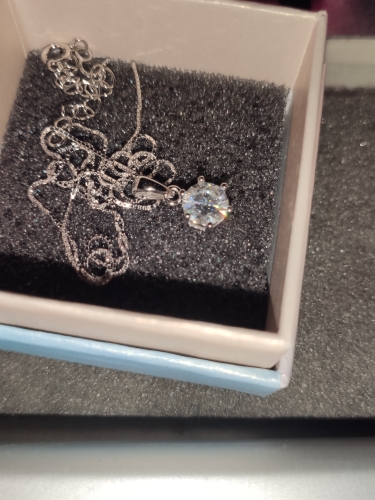 Great pendant with delicate chain. Someone in the reviews said that her jeweler told her it wasn't real silver nor real moissanite, FALSE, the acid test showed white, which means REAL sterling silver and the moissanite passes the diamond test. Great price, thank you.