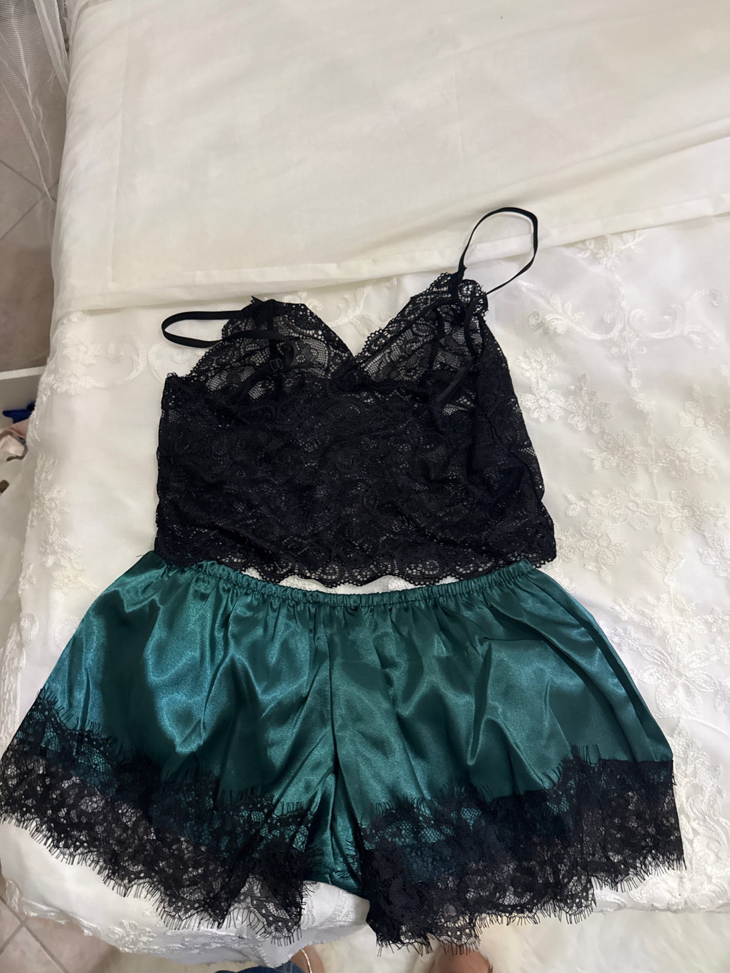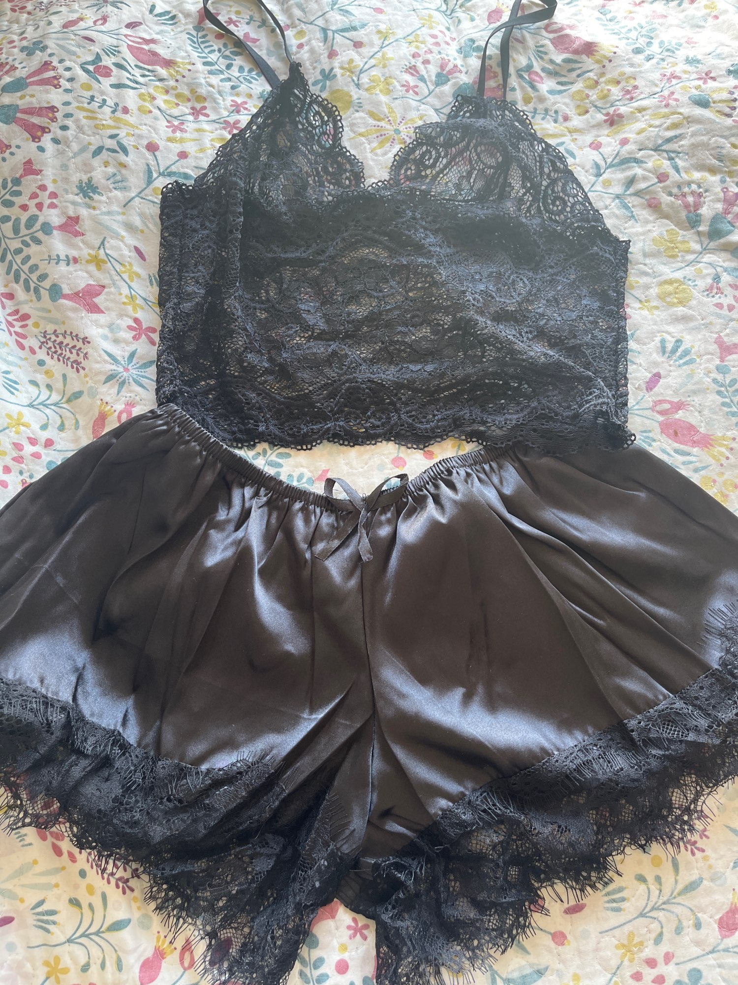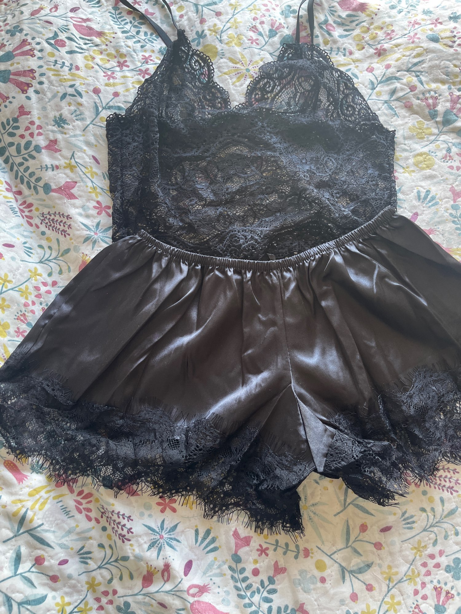 Beautiful! good quality, top somewhat delicate, very comfortable to sleep. Size M is for people in size S shirt, size 36 pants. I am M and size 40 42 and it fits me a bit fair, the shorts are short, with a size L XL for pants 40 42 it would be perfect, top size L for T-shirt people size M/L. Color and design exact to the one in the photo.