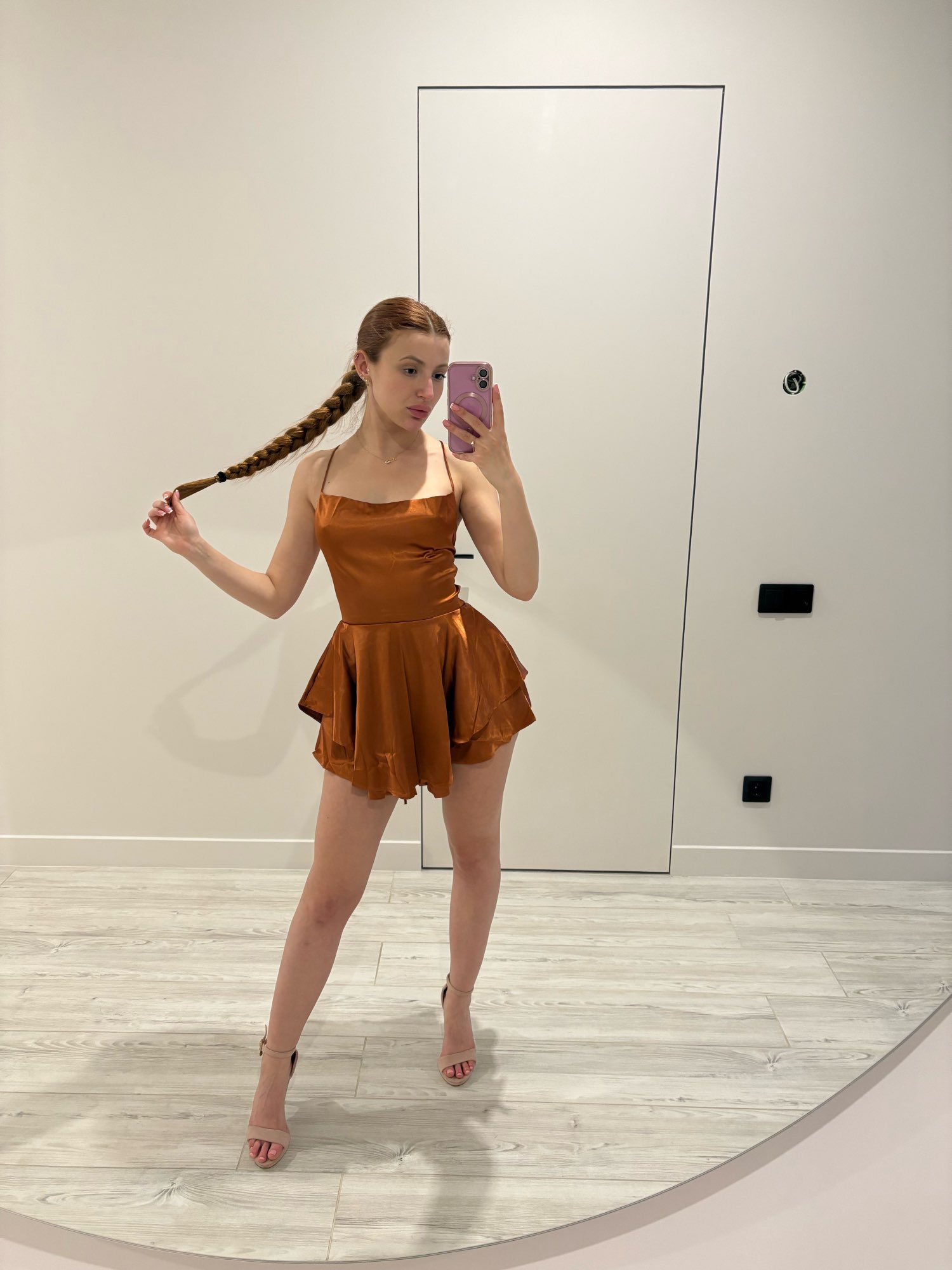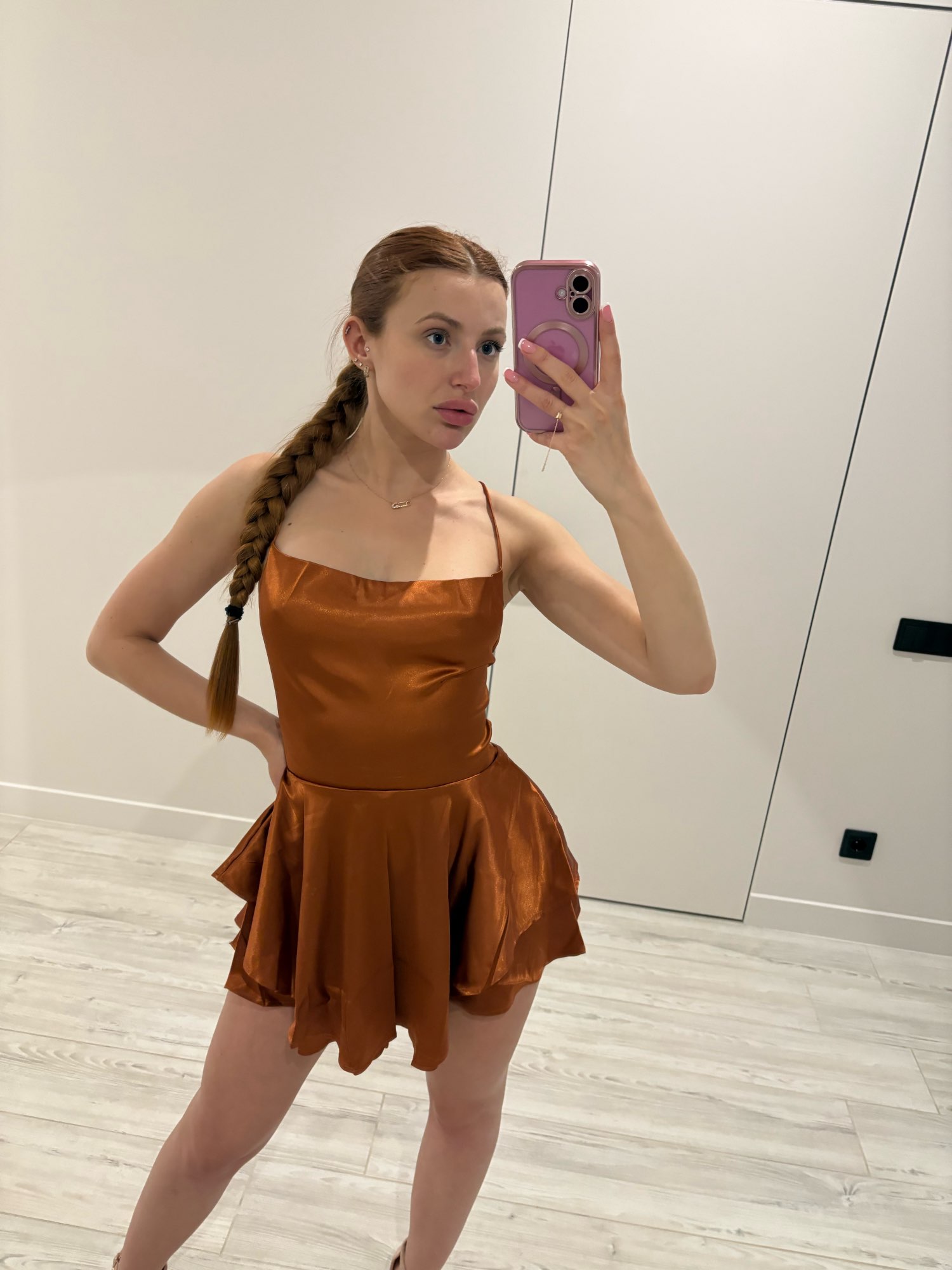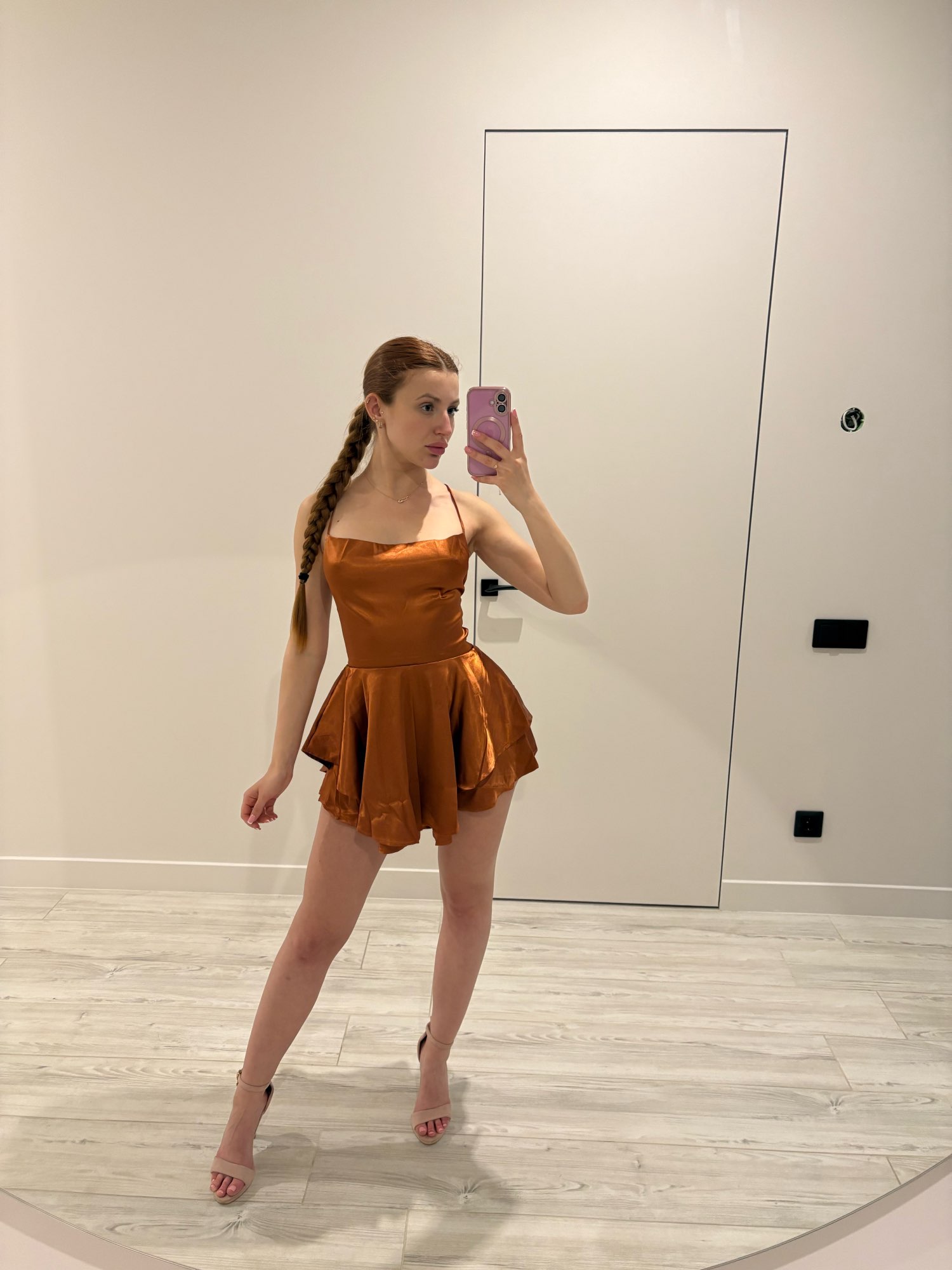 Just picked it up, immediately tried it on without ironing, ordered another Ukrainian-made one. I can say that this is sewn much better, the color is more burgundy and pinkish, great for girls with a cool undertone. Very satisfied with this dress, it fits like in the pictures, true to size. 🍑 Damn, how it poured. Arrived quickly