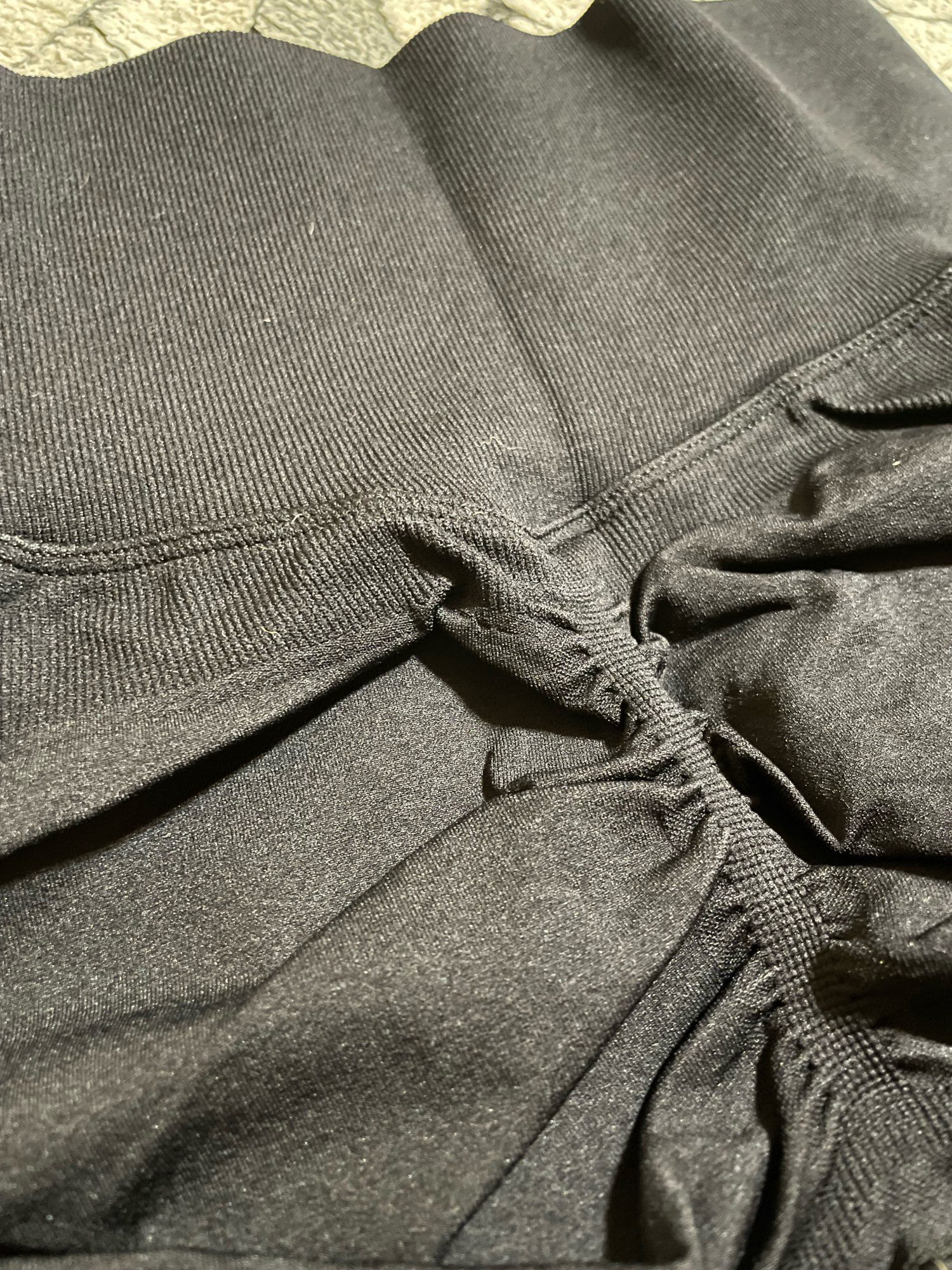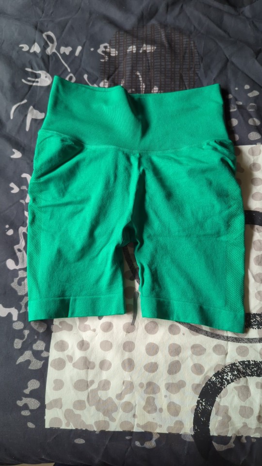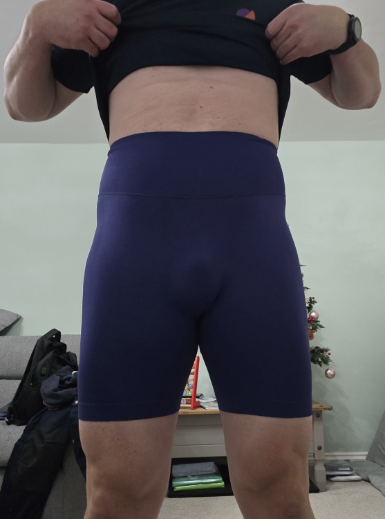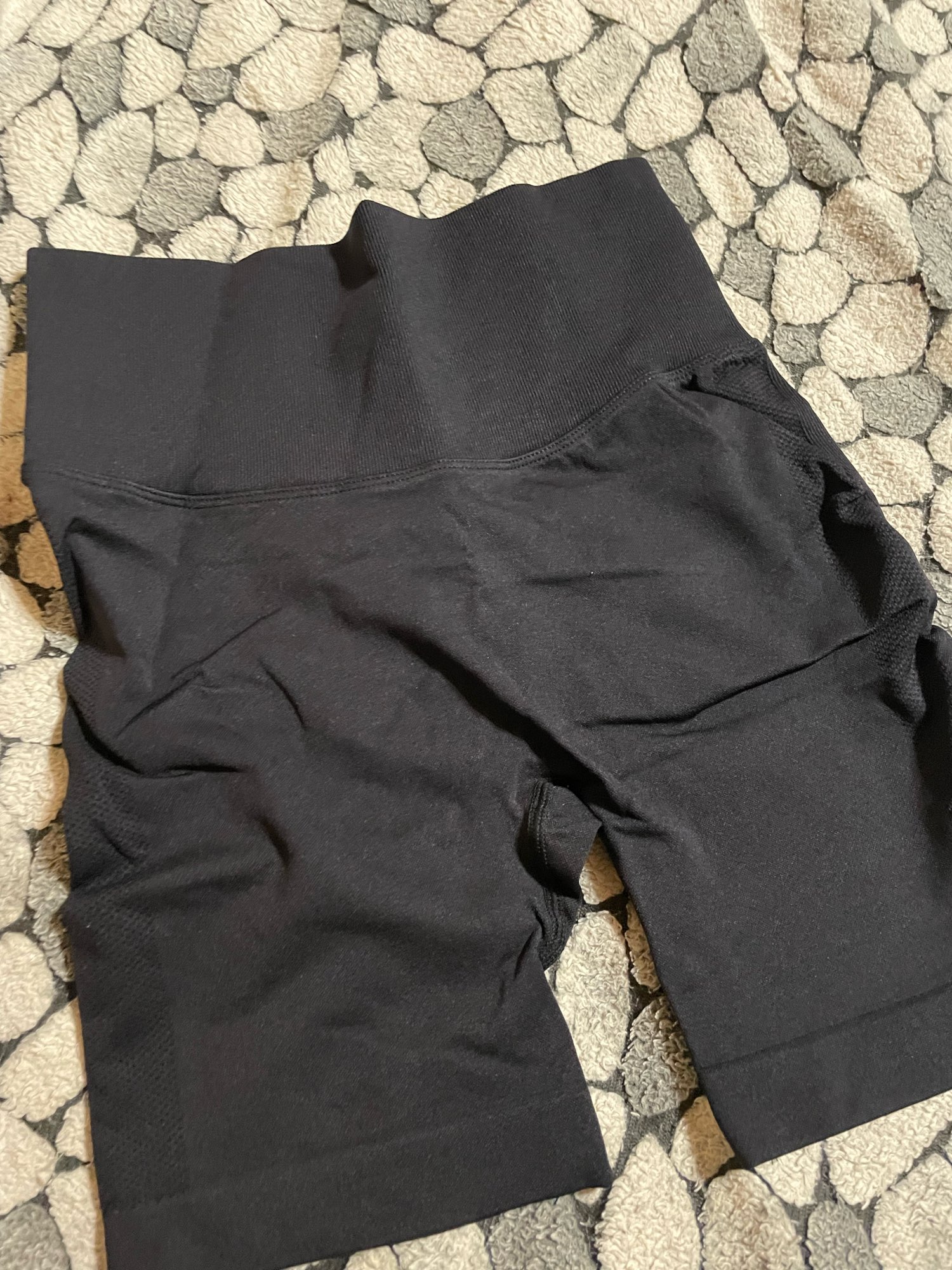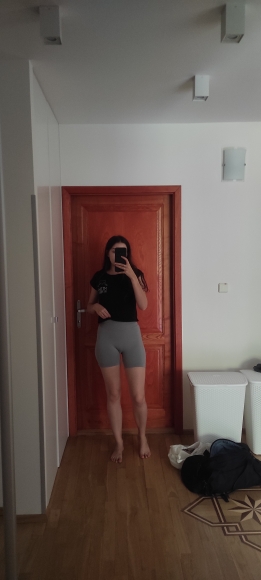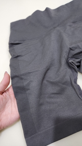 Nice biker shorts! Tight, thick, stretchy. High waist covers belly. Satisfying for sport and for casual outfits.