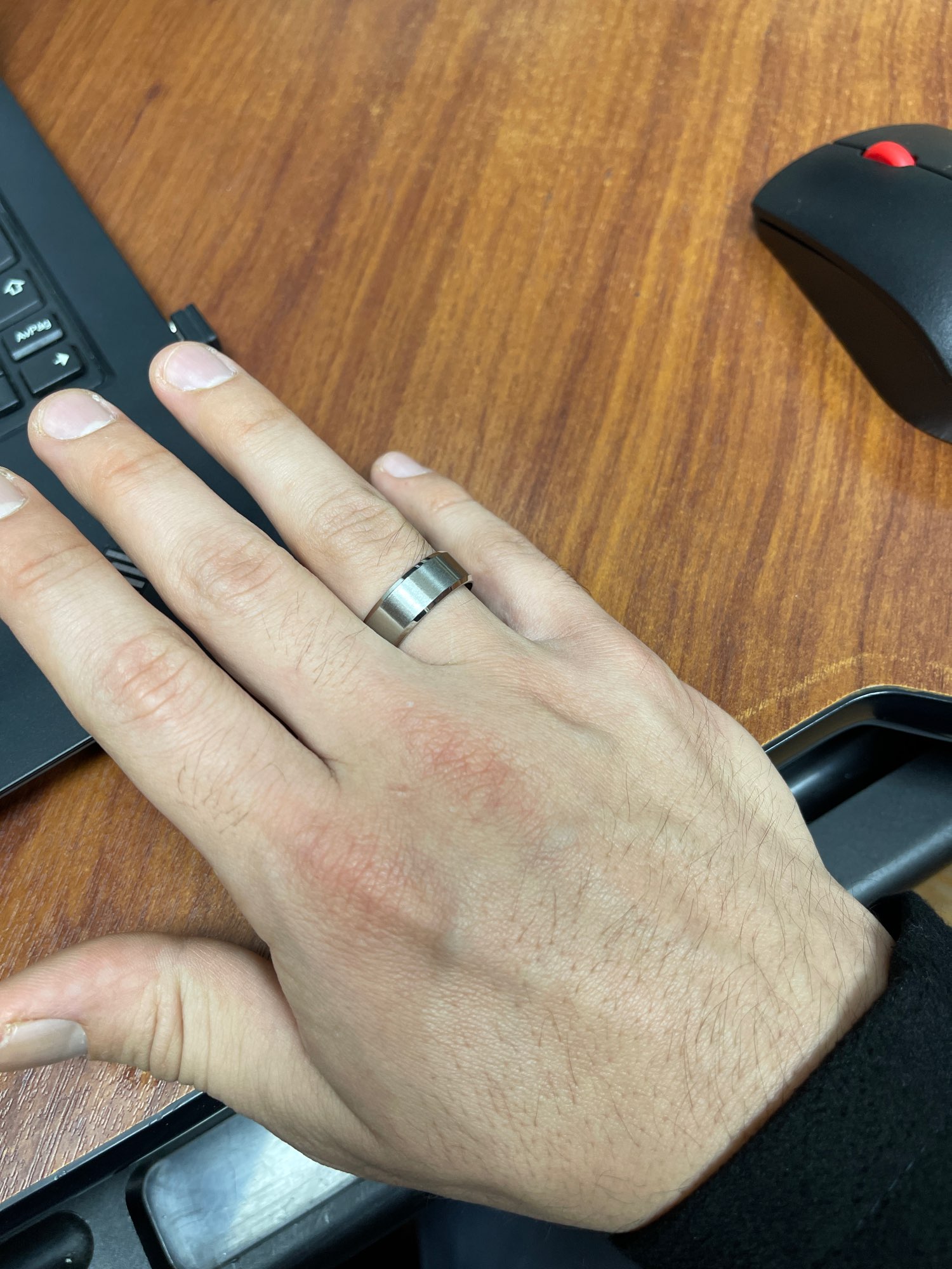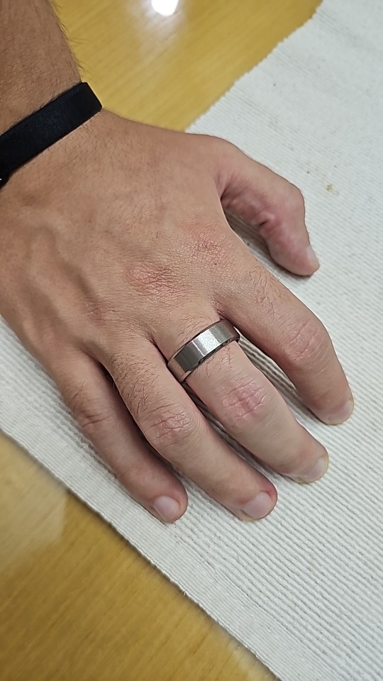 Excellent ring, durable and solid material. It doesn't seem to scratch easily. Just be careful with the sizes.